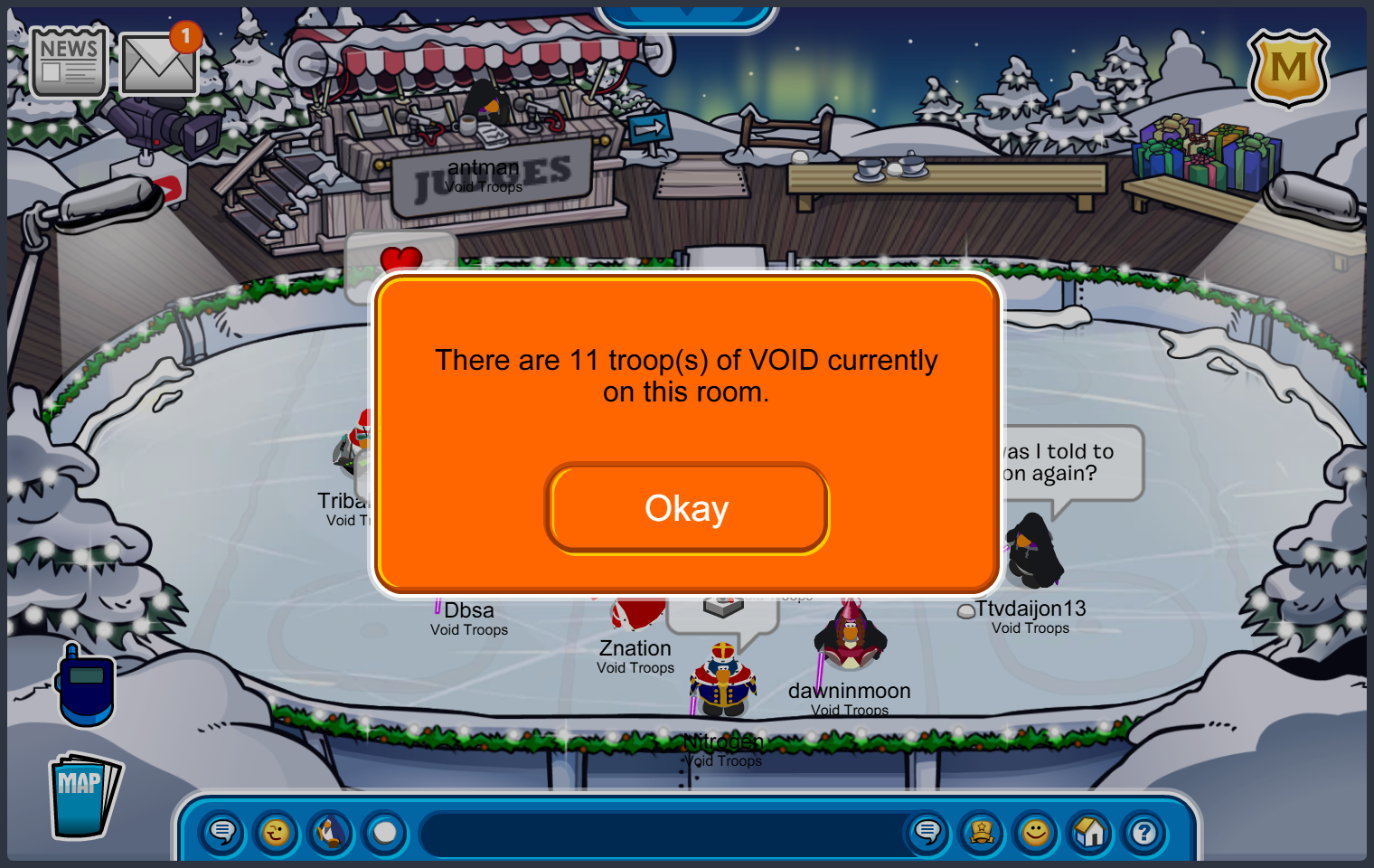 HI!!,Nitro here!today we logged into CPAB for UGLY-SWEATER-CONTEST!!(The ugliest penguin wins) RiRi was the winner of both rounds!!We maximized 15 void troops online!!