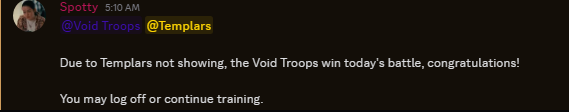 This one wasn’t close. It was a no-show for TCP and our troops took this advantage all the way to victory. Our formations and tactics were so crisp that TCP threw in the towel. After 1 round of domination, the judges were ready to call the VT Victory!