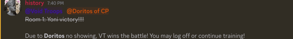 Another successful invasion in the books, and now our win streak has improved to 8. DCP no-shows once again, as they simply have no answer to our superior tactics and formations. This one was all VT from start to finish. After 10 minutes, the judges called VT Victory in what was a complete and total wipeout.