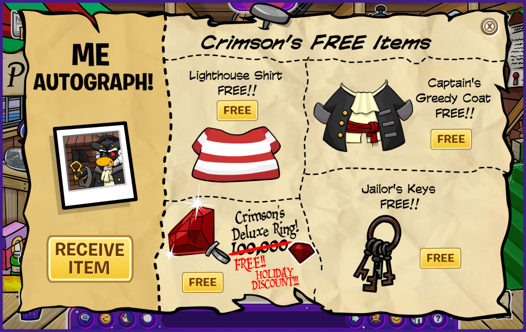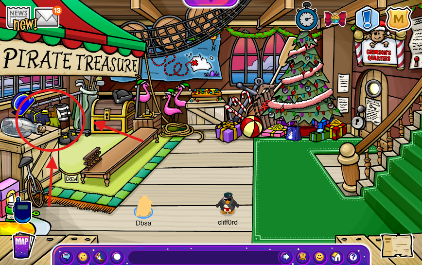Once you enter the Ship Hold, you’ll see Captain Crimson’s treasure! Click on the hanging clothes, and you will be able to see all of his items and even buy them. Luckily, though, the holiday discount gives you the items for free; maybe Captain Crimson is feeling generous this year!