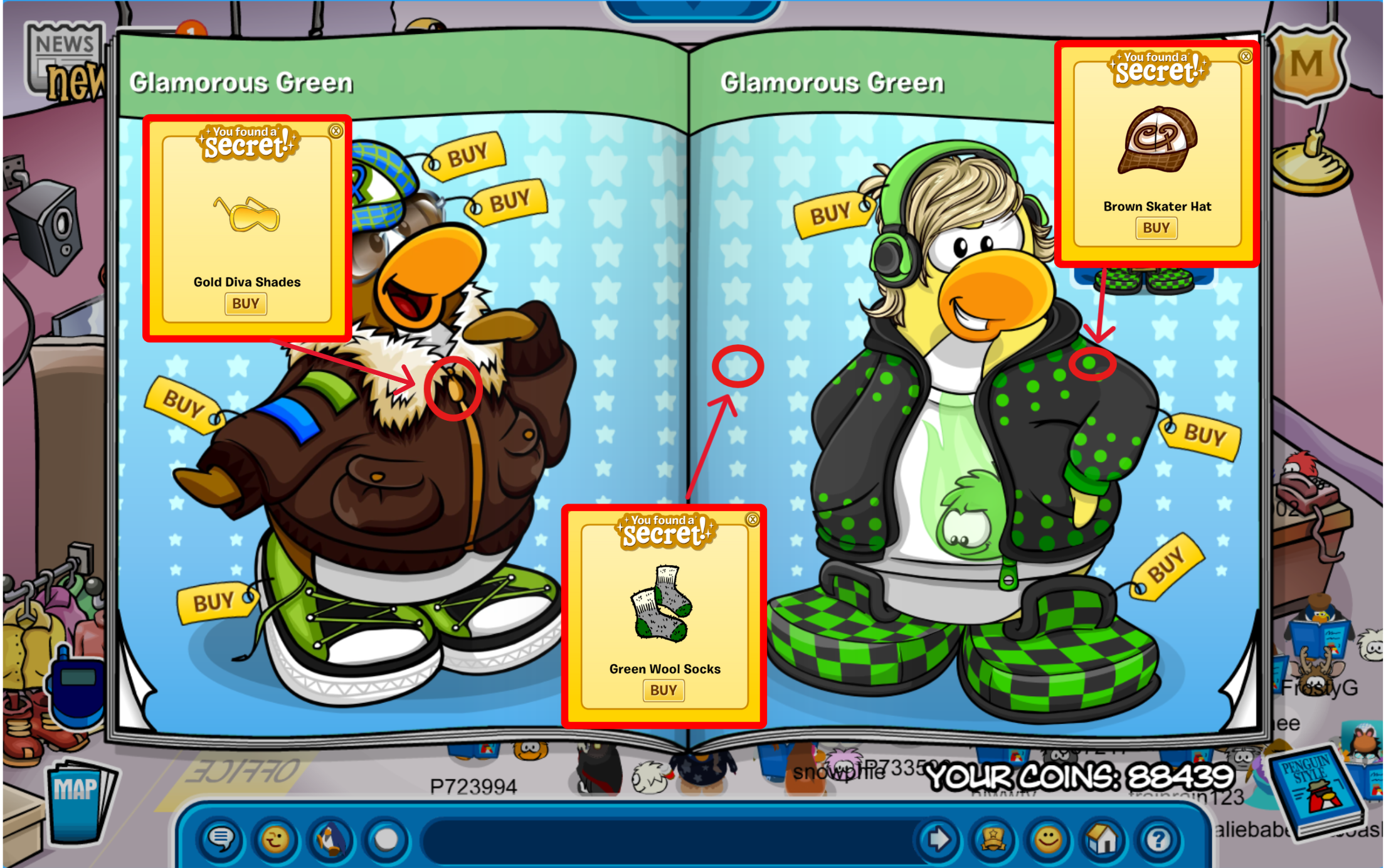 - Click on the green jacket spot to receive the Brown Skater Hat for 250 coins