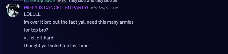 Since PIC and the people they surround themselves with seem complicit with the very actions they condemn and scorn (bullying children), we declare war on them and the little honor they’ve held on to. This is our first step in crushing grown, unemployed men who have well outgrown this community, yet still choose to spend their days harassing children on Discord. Seems for PIC, they’ll do anything to cope with the irrelevance and make something of their lackluster army careers.